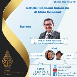 SuaraHeadline.com Jakarta – Perkumpulan Penulis Indonesia, SATUPENA, akan mendiskusikan perekonomian Indonesia di masa pandemi dan pasca pandemi. Melewati gelombang pertama dan kedua Covid-19, Indonesia dianggap berhasil menerapkan kebijakan yang seimbang antara pengendalian masyarakat terpapar, dan penyelamatan ekonomi nasional.