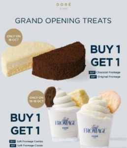 Dalam rangka merayakan grand opening, DORÉ by LeTAO menghadirkan promo spesial bagi para aDORÉbles — sebutan bagi para penggemar setia DORÉ by LeTAO. Nikmati penawaran Buy 1 Get 1 pada tanggal 16 Oktober 2025, di mana aDORÉbles bisa membeli Chocolat Fromage dan mendapatkan Original Fromage secara gratis.